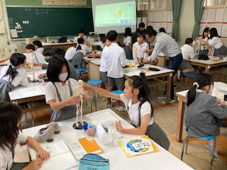 4年生の子どもたちが理科室で骨人形?(骨格模型?)で遊んでいました。いえ間違いです、しっかりと勉強していました。4年生の子どもたちは今、理科の授業で[体のつくり]について学習しています。体の中には曲がるところと曲がらないところがあって、曲がるところにはつなぎ目があって、骨と骨のつなぎ目を関節と言います。ヒトの体にはたくさんの骨があり、体を支えたり守ったりしています。なるほど…、子どもたちは先生の話を聴きながら…やっぱり…
