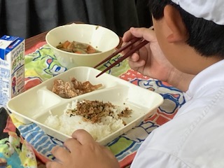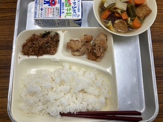 今日の給食のメニューは、鶏肉の竜田揚げ、厚揚げと野菜の煮物、おかか菜っ葉、牛乳、ごはんでした。鶏肉の竜田揚げは子どもたちも大好きです。ころもはカラッとお肉はジューシー、生姜の風味が効いています。厚揚げと野菜の煮物は和風仕立てで体にやさしい感じです。おかか菜っ葉はかつおぶしと大根の葉を炒めて、みりんと醤油で味つけし、最後にいりごまを加えています。ごはんによく合う一品です。