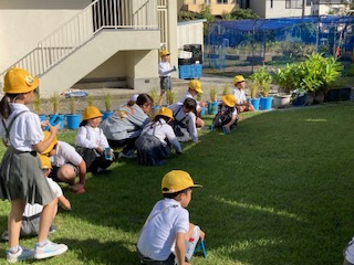 3年生の子どもたちが芝生広場で手かがみを持って確認しています。何の確認かというと、日光の進み方です。理科の[光の性質]という単元の学習をしています。手かがみを使ってはね返しした日光はどのように進むのかを調べています。まっすぐ進むのか、途中で曲がるのか、くねくね進むのか…、実際に試しています。手かがみを2枚使って、日光をつないだときの進み方も調べてみました。子どもたちはあたたかな日差しを浴びながら気持ち良さそうでした。