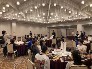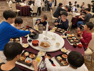 食事会場は大広間で、天井にはキラキラ輝くシャンデリアが飾られています。豪華な会場に子どもたちもキョロキョロしっぱなしです。夕食が一人一人個別に用意されていて、これまた見た目も豪華です。『何から食べようかな』…メニューも品数が多くて全部食べきれない子もいました。円卓なので友だちの顔を見ながら、おしゃべりしながら楽しく和やかな雰囲気で食べることができました。ご飯のおかわりをする子もたくさんいました。『お腹いっぱいー』『おいしかったー』…ここでも子どもたちの満足そうな顔が見られました。