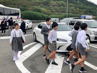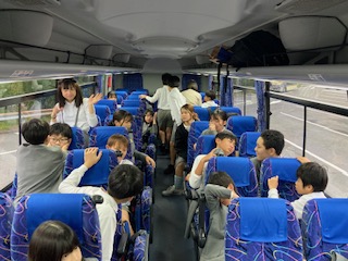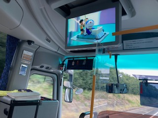 1回目のトイレ休憩のため、嬉野P Aに寄りました。14〜5人くらいしかトイレに行かず、あとは車内に残っていました。走行中の車内ではドラえもんのDVDを観ています。みんな真剣です(^_^)