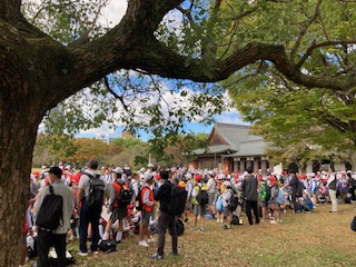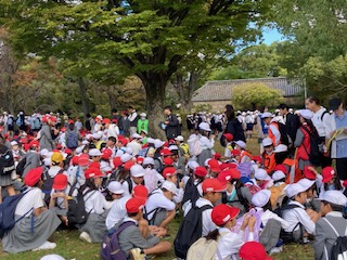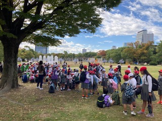 秋晴れの気持ちいい風が吹く中、大阪城公園に全校遠足に来ています。1年生から6年生までそろっての大移動です。これまでのキッズ班活動では、どんなことに気をつけたらみんなが今日の遠足を楽しく過ごすことができるか話し合ってきました。その成果を十分に発揮してほしいと思います。大阪城公園ではキッズファミリーで行動し、ポイントを回りながらゲームラリーをします。さあ今から出発です。元気に行ってらっしゃい!