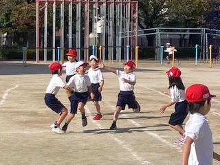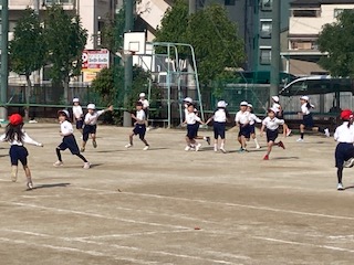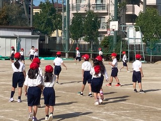 1年生の子どもたちが体育の授業で準備運動を兼ねて、鬼ごっこをしていました。『まて〜!』『にげろ〜!』…、子どもたちの楽しそうな声が運動場に響いています。赤帽子をかぶった鬼の子が白帽子のお友だちを追いかけます。『タッチ!』『つかまえたー!』…、挟みうちで頭脳プレイも見られました。いつの間にやら全員が赤帽子の鬼だらけです。『せんせー、もうつかまえる人おらんー!』…。