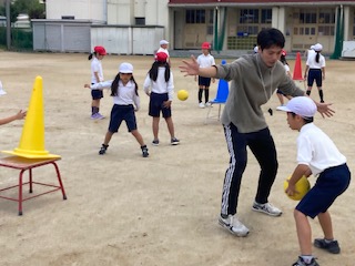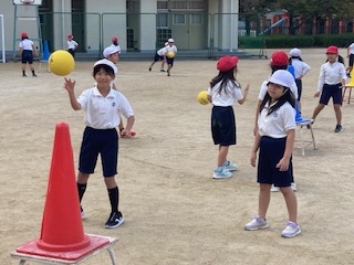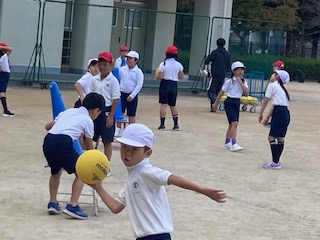 運動場では2年生の子どもたちが元気いっぱいに体を動かしていました。三角コーンを的に見立ててボールを投げて(シュートして)います。ボール投げゲーム(まとあてゲーム)です。子どもたちがボールを投げたり転がしたり、捕ったりする運動遊びを十分に楽しめるようにゲームを工夫しながら、簡単なボール操作の技術を身につけさせていきます。お互いによい動きを考えたり真似したりすることで、楽しみながら上達していけるといいですね。