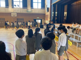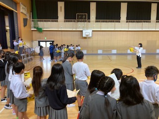 講堂では5年生の子どもたちが学習発表会に向けての練習を始めています。台本を手に持ってみんなで合わせたり確認したりしていました。5年生は[音読劇]と[合奏]に取り組むようです。先生も大きな声でてきぱきと指示していました。プロデューサーですね。さあどんな作品に仕上がるのか、まだまだこれからですが、大きく期待がふくらみます。