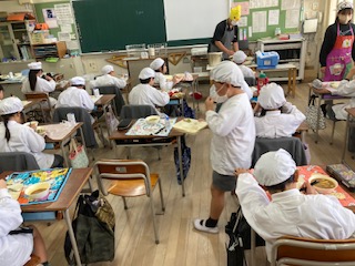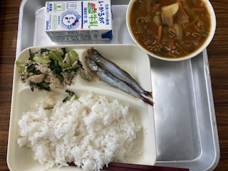 今日の給食のメニューは、焼きししゃも、里芋の和風カレー汁、ささみと小松菜の炒め物、牛乳、ごはんでした。焼きししゃもは焼き色がきれいにつくように、料理酒とみりん、綿実油で下味をつけて焼き物機でていねいに焼いています。里芋の和風カレー汁は昆布と削りぶしの出汁の風味を効かせて、里芋を入れることでさらに和風感が増していました。ささみと小松菜の炒め物はまいたけも使って食感にアクセントを加えています。