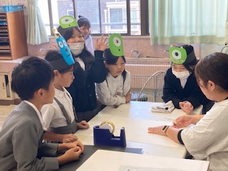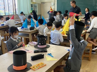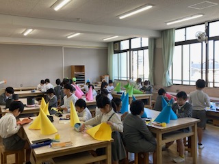 3年生の子どもたちが図工室に集まって、頭につけるかぶりものの飾り付けを作っています。学習発表会で使うアイテムのようです。みんな楽しそうです。どんな飾り付けにしようかな。何か色分けや形の違いによって役割りが違うのでしょうか。楽しみにしておきたいので聞きませんでした。なんか子どもたちの横顔を見てるだけでウキウキ気分になってきますね。
