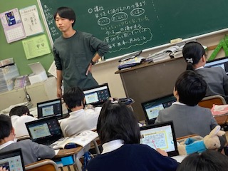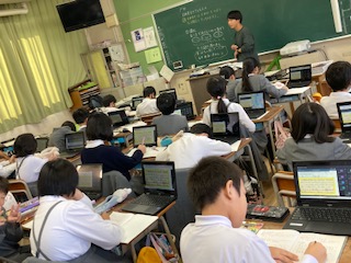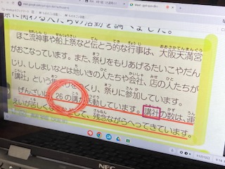4年生の社会の授業風景の一コマです。子どもたちの机の上には一人一人パソコンが置かれています。画面には教科書の一部分が大きく拡大されて映されています。ここに先生が直線ラインを引いたりマークをつけて強調したりすることで、子どもたちも間近で視覚的に理解したり集中したりしやすくなります。この他にも動画や友だちのノートなどを見たり共有したりしています。ICTの効果的な活用を目指して、先生もいろいろな授業の仕方を考えています。