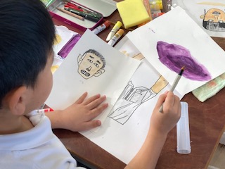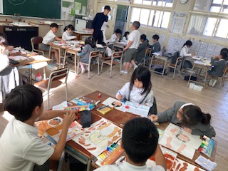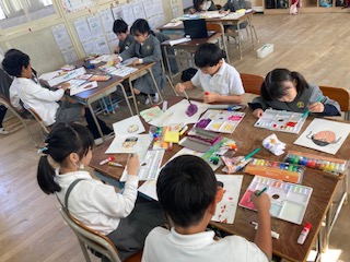 2年生の子どもたちが図工の授業で絵の具をしていました。のぞいてみると顔の部分、体の部分、さつまいもの部分の3つに分かれています。この3つを組み合わせて、先日に学習園で収穫したさつまいも、つまり[収穫の喜び]を表現しようということのようです。子どもたちの素直な気持ちが作品の中にきっと表れてくるのではないかなと思っています。これは期待ですね。