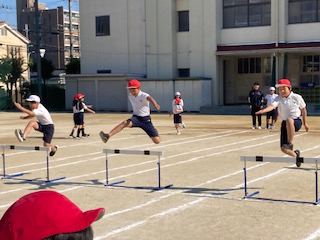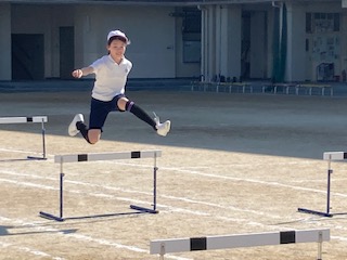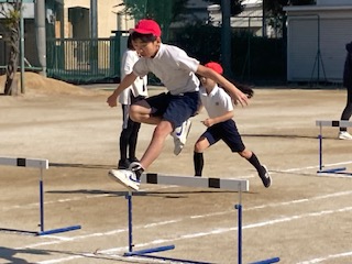 5年生の子どもたちが勢いよくハードルを跳び越えていきます。自分の跳びやすい3〜5歩のリズムを探しながら、できるだけスピードを落とさないようにしなければいけません。ハードル走はあまり高く跳んではいけません。理想はハードル手前遠くから踏み切ってハードルの高さギリギリに前に向かって跳ぶのが理想です。ハードル走にはハードル走の跳び方があるのですが、子どもたちはそのポイントを先生と一緒に確認しながら何度も練習を重ねていました。