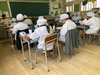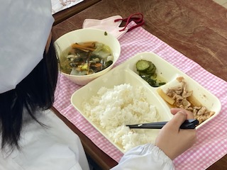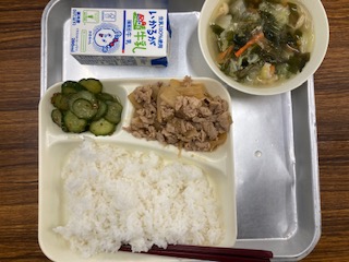 今日の給食のメニューは、豚肉のコチジャン炒め、鶏肉と春雨のスープ、きゅうりのナムル、牛乳、ごはんでした。豚肉のコチジャン炒めは豚肉と短冊に切った大根ににんにくを加えて炒め、コチジャンで甘辛く味つけをしています。ごはんがすすむ一品で、牛丼のようにして食べている子もいました。鶏肉と春雨のスープは具だくさんで、春雨のつるつるした食感を楽しむことができました。きゅうりのナムルはさっぱりとごま油の香りを効かしていました。