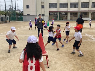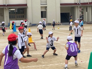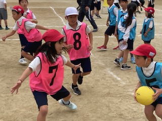 2年生の子どもたちの元気いっぱいの声が午後の運動場に響きわたっています。シュートゲームです。今まではチーム毎にパスやシュートの練習をしてきました。今日からはいよいよ相手チームとの対戦ゲームです。子どもたちの気持ちが高まらないわけがありません。どのコートでも熱戦が繰り広げられています。シュートが決まると、とび上がって喜ぶ子どもたちの姿がとても輝いて見えました。