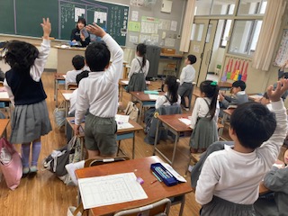 1年生の国語の授業風景の一コマです。先生と一緒に楽しく勉強しています。先生の問いかけに子どもたちは答えたくて仕方ありません。どんな質問にも『はいっ!はいっ!』と勢いよく手をあげています。子どもたちの発表したいという意欲が伝わってきます。先生もそんな子どもたちの様子を見て、とてもうれしそうな笑顔をしていました。遅くまで残って授業の準備をしている甲斐があるってもんですね。