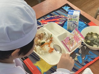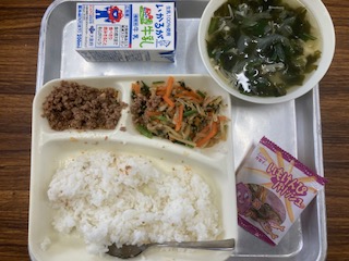 今日の給食のメニューは、ビビンバ、わかめスープ、芋けんぴフィッシュ、牛乳でした。ビビンバは韓国朝鮮の混ぜご飯で、牛豚ひき肉を主材に旬の大根やほうれん草、もやし、にんじんなどを細かく刻んでコチジャンで味つけしています。甘辛くておいしかったです。わかめスープはコクがあって透明感もあり、にらの香りがしっかりと効いていました。芋けんぴフィッシュは一人一袋です。