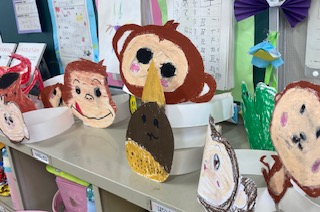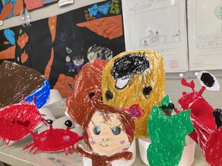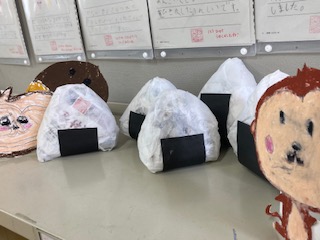 1年生の教室の後ろのロッカーの上に、さるかに合戦の小道具たちが並んでいました。1年生の子どもたちが作ったものです。学習発表会で使うみたいです。さるかに合戦は親ガニを意地悪なサルに殺された子ガニたちが仇討ちをするという、どちらかと言えば怖い物語なのですが、でもこれを見ていると、なんだか心おだやかなほっこりした気分になってきますね。