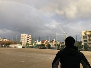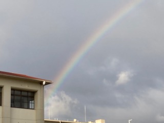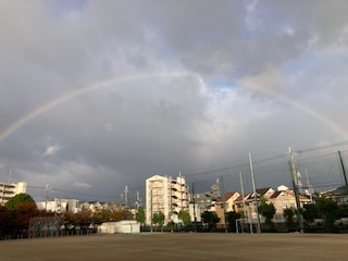 今朝(7:40頃)、学校に出勤したときに空を見上げると、写真ではわかりにくいですが、赤・橙・黄・緑・青・藍・紫の7色が本当にあざやかな虹がかかっていました。しかもまるでかけ橋のように端から端まできれいな状態で見えました。ちょうど降っていた小雨が止み、朝陽の光が雲の合間から差し込んでいるときでした。ふと視線を横にずらしてみると、後ろ姿のシルエットが…。そこには腰に手をあてて力強い姿勢で虹を見上げながら、今日一日の子どもたちの充実した学校生活と安全を願う教頭先生の姿がありました。