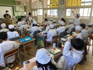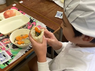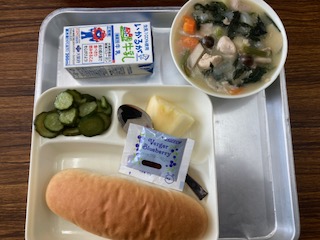 今日の給食のメニューは、鶏肉ときのこのシチュー、きゅうりのピクルス、りんご、牛乳、パンでした。鶏肉ときのこのシチューは3種類のきのこの他にも具材たっぷりで、またほうれん草の緑が彩りをあざやかにしていました。アレルギー対応用のルウを使っています。きゅうりのピクルスはあっさりとした味つけです。りんごは一人4分の1切れです。3枚目の写真…シチューにパンをつけて食べる子は普通によく見かけますが、パンに穴をあけてシチューを流し込むパターンは給食ではレアですね。(^_^)OK