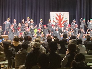 発表が終わった後に、家族の皆さまや地域の皆さまからの大きな拍手をもらったときの子どもたちの喜んでいる顔やホッとした様子が印象に残りました。子どもたちにとって大勢の人の前や舞台の上で表現する機会はそんなに多くはないと思います。また緊張もするし恥ずかしい思いもあると思います。しかしそんな中でも、少しでも精一杯勇気を出して自分を表現したり、表現することが楽しいと思うことができたりしたらいいなと思っています。その経験が今後のさらなる成長に生かされることを願っています。またご家庭におかれましても、今日の子どもたちの頑張りや成長を大いにほめてあげていただけたらと思います。今日は多くの保護者の皆さまや地域の皆さまにご参観いただき、本当にありがとうございました。
