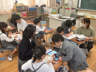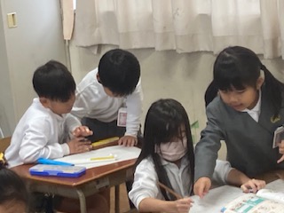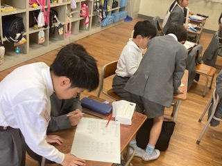 1年生の教室をのぞいてみたら[ミニ先生だらけ]でした。あっちにもこっちにもミニ先生。課題が終わった子はミニ先生となって回ってくださいと大きな先生に頼まれました。『わからないひといますか〜』『だれかおしえてほしいひと〜』『だれかおしえさして〜』…もはや教えることをお願いしている状態です。『おしえてもらっていいですか』…教えられる方も気をつかいます。でも大きな先生はおお助かりですね。