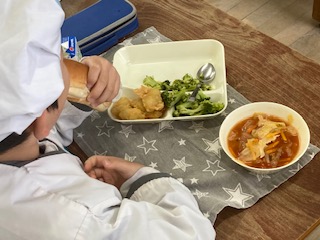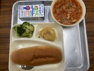 今日の給食のメニューは、白身魚のフリッター、ミネストローネ、ブロッコリーのサラダ、牛乳、パンでした。白身魚のフリッターはタラを使っていて身が厚くてやわらかく、衣もしっかりとついていて食べ応えがありました。フリッターとは小麦粉や泡立てた卵白などで作った衣をつけて油で揚げたものです。ミネストローネは具だくさんでトマトの酸味を生かして、にんにくとオリーブ油で香りよく仕上げられていました。ブロッコリーのサラダはさっぱりとした手作りのドレッシングがかけられていました。
