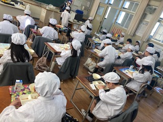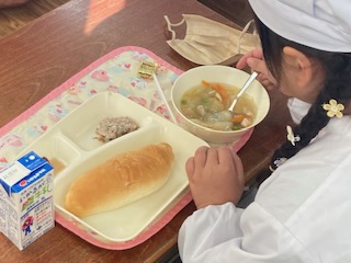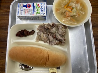 今日の給食のメニューは、豚肉のバジル焼き、スープ、うずら豆のグラッセ、牛乳、パンでした。豚肉のバジル焼きは豚肉にワイン、塩こしょう、バジル、オリーブ油で下味をつけてから玉ねぎと混ぜ合わせて焼き物機で香りよく焼き上げています。スープはチキンブイヨンをベースに味をととのえ、鶏肉の旨みを生かしたスープになっています。大根がやわらかくておいしかったです。うずら豆のグラッセは砂糖と塩、オリーブ油で味つけして甘く煮た洋風の一品です。