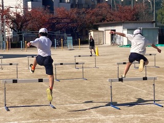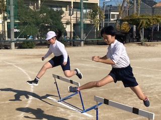 『今日は記録とるでー』…『えーまじでー』『やばい』『上手く跳べるかなぁ?』『若干緊張するわー』…。5年生の子どもたちがハードル走の記録をとっています。これまで子どもたちは体育の学習でハードル走に取り組んできました。スピードに乗りながらリズムよくハードルを跳び越えていく練習を何度もしてきたので、みんな少しずつ上手になってきています。さあ練習の成果をしっかりと発揮していきましょう。走り終わったらやっぱり記録が気になるみたいです。みんなすぐに先生のところに走り寄っていました。