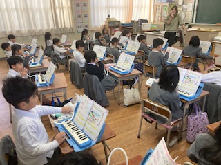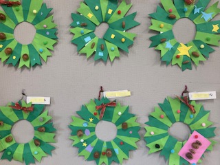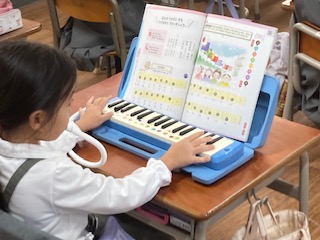 1年生の教室から子どもたちの吹く鍵盤ハーモニカの音が聞こえてきました。先生と一緒ドドレレミミファファソソ・・・と鍵盤の位置を確認しながら、みんなで同じ音が出せているか聞き比べていました。子どもたちの小さな指が鍵盤の上をぴょこぴょこと行ったり来たりしています。かわいいですね。教室の後ろには子どもたちが作ったクリスマスリースが飾ってありました。サンタさん来てくれるかな。