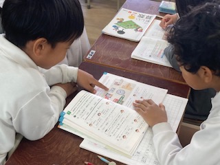 2年生の算数の授業風景の一コマです。習った九九を利用して『何倍か』という問題に取り組んでいました。例えば[アのテープは2cmです。4ばいの長さは何cmですか。][イのテープは3cmです。6ばいの長さは何cmですか。]のような問題です。九九はマスターしていますので、文章問題から式を導き出して、その考え方を自分の言葉で説明できることが大切です。子どもたちはお互いに自分の考えを交流したり、中には熱く身振り手振りで説明している子もいました。