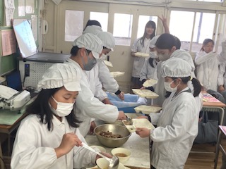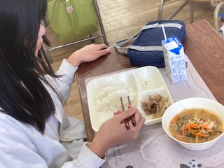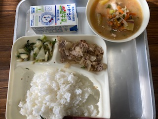 今日の給食のメニューは、豚肉の生姜焼き、さつまいものみそ汁、きくなと白菜の胡麻和え、牛乳、ごはん、でした。豚肉の生姜焼きは生姜の風味がしっかりと感じられ、ごはんがすすみました。さつまいものみそ汁はさつまいもだけでなく野菜もたくさん入っていて体に良さそうでした。きくなと白菜の胡麻和えは旬のきくなと白菜を合わせ、しょうゆベースのたれにいりごまをふりかけています。