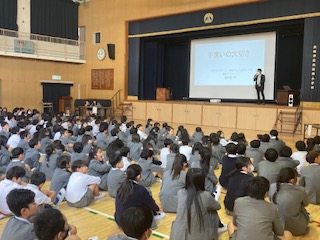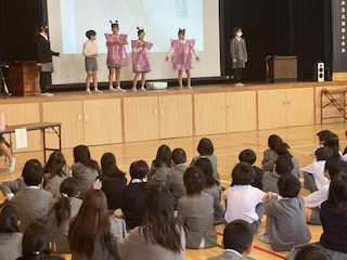 午後から講堂で『学校保健委員会』を行いました。学校医先生と薬剤師先生にも参加していただきました。学校保健委員会は学校医の協力のもと、児童のさらなる健康の保持増進を目指していくものです。今日のテーマは[正しい手洗いの仕方]でした。保健委員会の子どもたちの発表や学校医の先生のお話を通して、子どもたちはウイルスなどから身を守る方法を学ぶことができました。これから寒さが厳しい時期へと入っていくので、手洗いはもちろんのことですが、健康や体力に十分に気をつけて生活をしてほしいと思います。