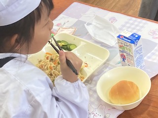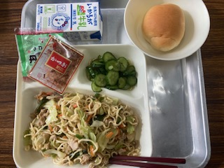 今日の給食のメニューは、和風焼きそば、きゅうりの生姜漬け、ソフト黒豆、牛乳、パンでした。和風焼きそばは豚肉と細かく刻まれた野菜がたくさん入っていて、醤油ベースの味つけの和風仕立てでした。かつお節をふりかけて食べました。きゅうりの生姜漬けは生姜の風味が十分に感じられ、とてもあっさりとしていました。ソフト黒豆はやわらかく、おやつ感覚でいただきました。