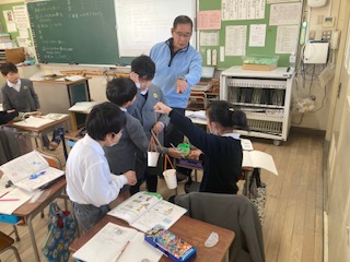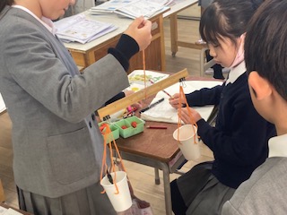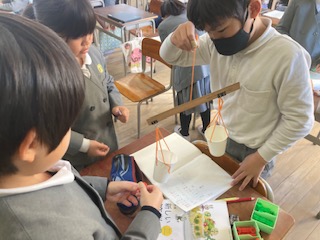 3年生の子どもたちが楽しそうに学習していました。理科の授業の様子です。手作りの天秤(てんびん)ばかりを使って、ものの重さを比べていました。はさみやのり…、紙コップに入るものは何でも入れてみます。かたむき方が下がっている方が重いことがわかりました。もっとわかりやすく比べる方法はないのかな…、もとにするものを使うことにしました。例えば、おはじきを何個分とかブロックを何個分とか、1円玉を何個分とかです。なるほど、こうするとさらにわかりやすいですね。