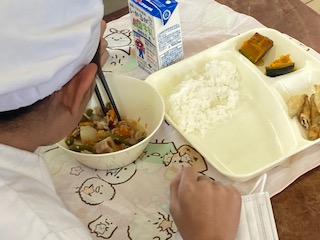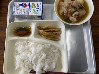 今日の給食のメニューは、きびなご天ぷら、含め煮、焼きかぼちゃの甘みつかけ、牛乳、ごはんでした。きびなご天ぷらは衣が少し厚めで、ゆず果汁で作ったタレがかかっていました。含め煮は和風仕立てのやさしい味つけで、色合いもよく具だくさんでした。焼きかぼちゃの甘みつかけはかぼちゃの甘みとみつの甘みが合わさってダブルの甘さでしたがしつこくなく、デザート感覚で食べれました。