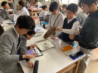 4年生の理科の授業で[冬の生き物の様子]という学習です。冬になると寒い日が多くなり、これまで身の回りで見られた生き物や植物はどうなっているのかな。子どもたちは自分たちの経験から思ったことを進んで発表していました。そして今日は夏に育てたヘチマの観察です。実が茶色くなって枯れてしまっています。でも中から真っ黒い種がたくさん出てきました。みんなで数えます。皮もむいてみたら網目模様の繊維も出てきました。先生が『昔はヘチマで体を洗ってたんやで』子どもたちは『えーっ!』…そこに中から虫も出てきてまたまた子どもたちは『えーーーーっ!』となっていました。
