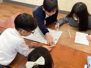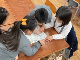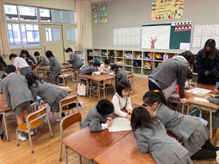 1年生の子どもたちが[新春・先生の手作りすごろく大会]です。先生が子どもたちのために、手作りのすごろくを用意してくれていました。さっそくサイコロを振ってスタートです。みんな一斉に身を乗り出して騒いでいます。止まったマス目には先生からの指示が書かれていました。みんなで大きな声で読んで、書かれている指示に従います。『たのしいー!』『おもしろいー!』…、みんなとても盛り上がっていました。