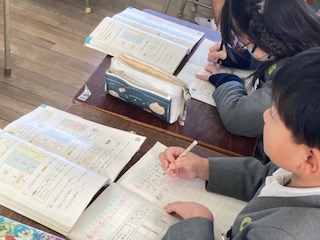 2年生の子どもたちが算数の授業で[千の位までの数]について勉強していました。千の位が2、百の位が3、十の位が5、1の位が4…合わせると『2354(二千三百五十四)』です。先生が千の位までの数の読み方や書き方の問題を出してくれます。子どもたちは『できるよー』『もっと問題出してー』ととても楽しんでいる様子でした。また積極的に手をあげて発表する子たちもたくさんいましたよ。