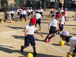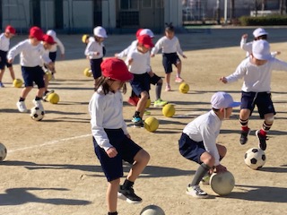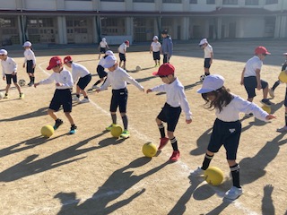 1年生の子どもたちが体育の学習でボールを足で扱う運動遊びをしていました。見ていると、ボールで遊んでいるのか、ボールに遊んでもらっているのか、はたまたボールに遊ばれているのか…、普段なかなかやらないことなので、みんなあっちに行ったりこっちに来たり。でも先生たちはどの子にも『じょうず じょうず じょうず じょうず』と声をかけてあげます。そうです、かわいければOKなんです!