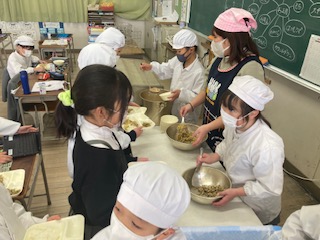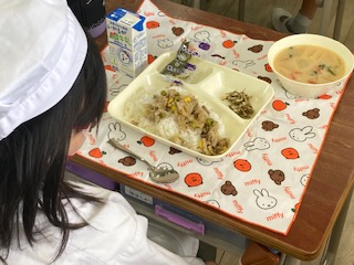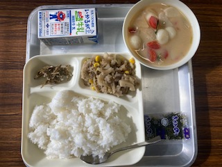 今日の給食のメニューは、れんこんのちらしずし、ぞう煮、ごまめ、牛乳でした。れんこんのちらしずしはれんこんと豚肉、かんぴょう、グリンピース、コーンを使っていて、そこに粉末こんぶを加えて旨みを増しています。ぞう煮は白みそを使った関西風で、なにわの伝統野菜の金時にんじんも入っています。おもちは白玉もちで結構やわらかいです。ごまめは醤油と砂糖で作った甘辛いタレを小さなカタクチイワシに絡ませた料理です。[田作り]ともいわれ、昔、肥料としてイワシを田にまいたところ、豊作になったことから豊作を願う気持ちが込められています。