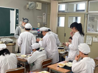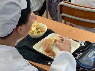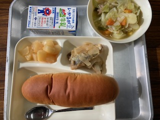 今日の給食のメニューは、アジのレモンマリネ、てぼ豆のスープ煮、白桃(缶)、牛乳、パンでした。アジのレモンマリネは油で揚げたアジに、玉ねぎとレモン汁、砂糖、塩、米酢、ワインで作った調味液をからませて、最後に生のレモンをしぼることでさらに風味豊かにしています。てぼ豆のスープ煮は洋風仕立ての仕上がりで、使っている具材も多くて彩りもきれいでした。白桃(缶)は甘くてよく冷えていました。