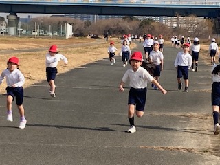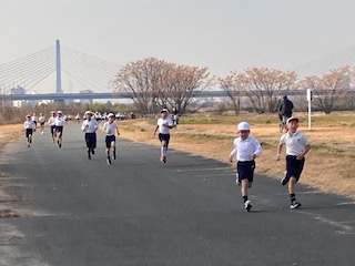 1年生は初めてのミニマラソン大会です。笑顔でそしてしっかりとした足取りで走ることができていました。他の学年の子どもたちも学年が上がるごとにたくましさが感じられ心強く思いました。また卒業を前にして最後のミニマラソン大会で6年生が一生懸命に走っている姿は見ている周りの人たちを感動させました。どの子たちも一人一人が輝いて見えました。淀川河川敷にはたくさんの保護者の皆さまが応援にかけつけていただき、子どもたちにも大きな励みになりました。3学期が始まって、休み時間や体育の授業でかけあしに取り組んできました。自分のペースを保って最後まで走り切ることを目標に頑張ってきました。今日、その成果をしっかりと出すことができたと思います。ほっぺたを真っ赤に染めながら力強く元気に走る子どもたちの姿に、この一年の大きな成長を感じることができたのではないでしょうか。子どもたちにとっても大きな自信になったことと思います。応援に来ていただいた保護者の皆さま、本当にありがとうございました。