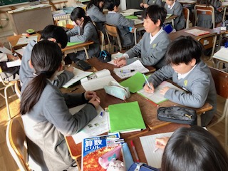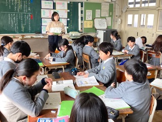 [話し合いを通して自分の考えを深めよう]が今日のテーマです。国語の教科書に[ロボットとの未来を多角的にとらえる]ことについて論じている文章が載っています。子どもたちはロボットのメリットやデメリット、必要派や不必要派に分かれてそれぞれの視点から意見を述べていきます。付箋を貼ってわかりやすくまとめたりもしました。友だちの発表を聞いて感じたことを交流し合います。はじめに抱いた自分の考えに変化が生まれたでしょうか。話し合うことを通して、さらに考えが深まったと感じられたらすばらしいですね。