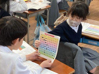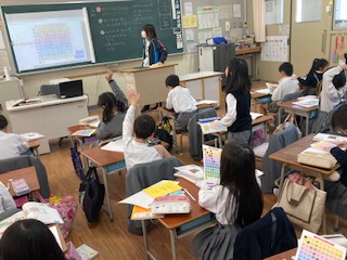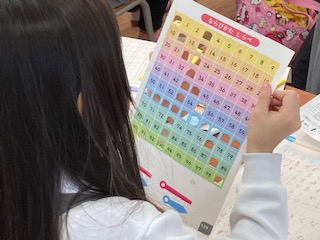 1年生の子どもたちがビンゴ大会をしていました。でもよく見ると、ビンゴカードのマス目が多過ぎます。実は算数の授業で[100までの数]の学習でした。100までの数がどのように並んでいるのか、一の位や十の位に注目しながら気づいたことを隣りの子と伝え合ったりみんなの前で発表したりしていました。マス目に穴をあけていたので、てっきりビンゴ大会かと思ってしまいました。確かにビンゴ大会ならもっと騒がしく盛り上がっているはずですね。妙におとなしくて静かでした。