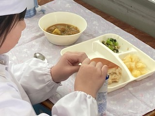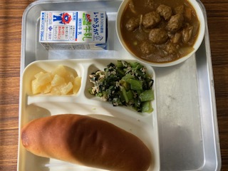 今日の給食のメニューは、ミートボールと野菜のカレー煮、ツナと小松菜のソテー、パインアップル(缶)、牛乳、パンでした。ミートボールと野菜のカレー煮はやわらかい肉団子が特徴的でカレースープがしっかりとしみ込んでいて、子どもたちが大好きな一品です。野菜もたくさん入っていました。ツナと小松菜のソテーは塩と醤油のシンプルな味つけですがおいしかったです。パインアップル(缶)は冷たくて甘かったです。