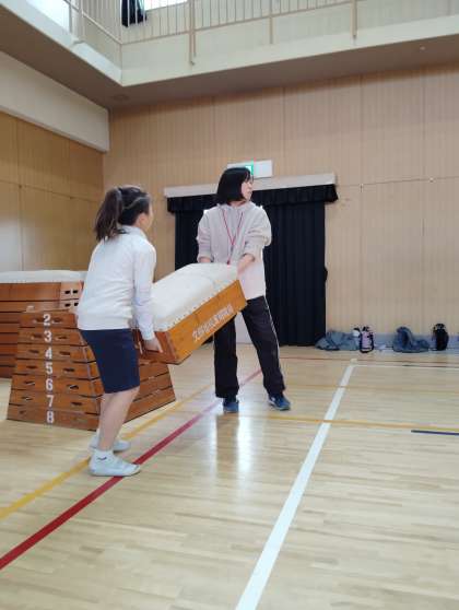 3時間目に5年生が体育で跳び箱に取り組むようです。まず初めに担任の先生が準備の指示をしています。運び方、設置場所、向きなど細かく指示しています。このきめの細やかさが事故を防ぐことにつながります。子どもたちもしっかりと指示を聞き、協力して準備しています。担任の先生との絆を感じますね。