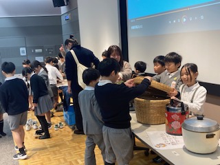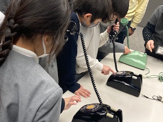 実際に手に取って体験できるものもありました。例えば当時の洗濯板や洗濯機、炊飯器や保温器、電気アイロン、電話などです。特に子どもたちのお気に入りはやっぱり黒電話でした。子どもたちはダイヤルを回すことを知らないので、『おかしいなぁ』『どうやって使うんだろう』と言いながら、一生懸命に指でダイヤルの穴の中に見える数字をプッシュしていました。その他にも実際に蓄音機で音楽のレコードを聴かせてもらいました。なんともレトロな雰囲気に子どもたちも『ふしぎな気持ち』と答えていました。