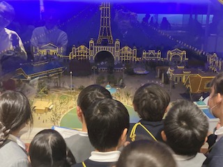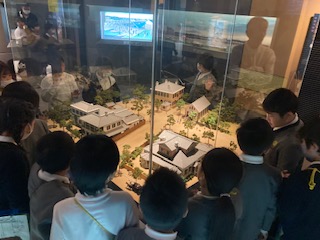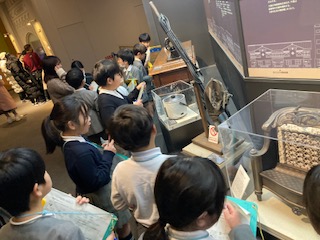 昔の町並みの見学では興味津々で目がキョロキョロしてしまいました。授業で習ったものを見つけると、うれしそうに周りの友だちに伝えている子がたくさんいました。『昔の暮らしもしてみたいな』『なんか楽しそうやな』とつぶやいている子もいました。子どもたちはすべての展示物をのぞき込んでは熱心に分かったことや気づいたことをプリントに書き込んでいました。全員が興味を持って見学し、積極的にメモを取ったり感想を言い合ったりしているので、他のお客さんが『この子たちめっちゃ頑張ってるね、すごいね。』と褒めてくれていました。ちなみに電車の中でのマナーや歩くときの様子などもとても素晴らしかったですよ。