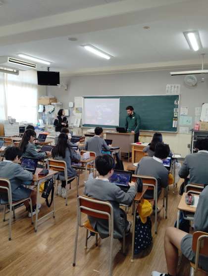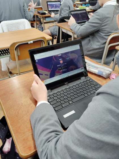1時間目、6年生の教室から楽しそうな声が聞こえてきました。英語の授業でした。マイケル・サンジェロ先生の作ったクイズに挑戦しているようです。どうすれば子ども達が楽しく学習できるかしっかりと考え、工夫をこらした授業を展開してくれています。それにしても子ども達はダブレット好きですねぇ。当たり前のように使いこなしています。