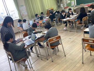 3年生の子どもたちが先週に行った[大阪くらしの今昔館]への社会見学を活かして[道具の移り変わり]についてまとめていました。実際に見たり聞いたりしたことと、さらにインターネットで調べたことなどをおりまぜながら、50年くらい前や30年くらい前、そして現在にわたってプリントにまとめていきます。そこに自分の感想などもちゃんと付け加えているところなんか、とても素晴らしいなと思いました。
