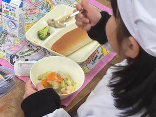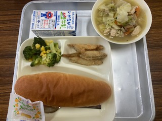 今日の給食のメニューは、わかさぎフライ、スープ煮、ブロッコリーとコーンのサラダ、牛乳、パンでした。わかさぎフライは衣がサクッとなるよう上手に揚げられていて、身もしっかりと付いていました。骨がやわらかく丸ごと食べられるので、カルシウムをたくさん摂ることができます。スープ煮はチキンスープをベースにした洋風仕立ての煮物で、鶏肉とキャベツ、たまねぎ、にんじん、マッシュルーム、パセリが入っていました。ブロッコリーとコーンのサラダは甘酸っぱいドレッシングがかかっていました。