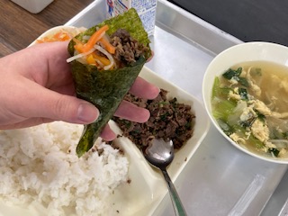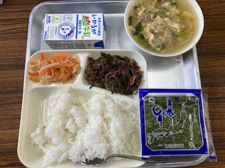 今日の給食のメニューは、キンパ、卵の中華スープ、牛乳でした。キンパは韓国風海苔巻きのことで、日本の海苔巻きとの違いはごま油を使っているのが特徴です。ごま油と生姜、にんにく、コチジャンなどと一緒に香りよく炒めた牛肉と、もやしとにんじんのナムルを海苔で巻いて食べます。子どもたちは上手に巻けるのでしょうか、ちょっと心配です。卵の中華スープは卵だけでなく焼き豚、たまねぎ、チンゲンサイ、えのきも入っていて具だくさんです。いつもより少し豪華な感じがしました。